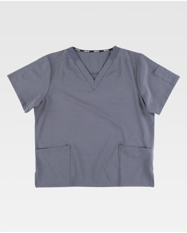 Casaca sanitaria recta cuello pico con elástico, dos bolsillos laterales, bolsillos para bolígrafo y un bolsillo en manga. Casaca manga corta unisex con aberturas en laterales y canesú en la espalda para amoldar mejor en los hombros. Fabricado en las tallas S, M, L, XL, XXL, 3XL.