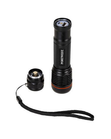 Linterna de mano, resistente, recargable por medio de USB, brillo aproximado de 600 lúmenes, tiene una duración aproximada con la carga completa de 4 horas, cuenta con varias funciones de intensidad, alto, medio, bajo, SOS y Flash, la batería es recargable Li-ion, con una capacidad de 2200mA, también puede ser usada como batería de emergencia para cargar el móvil.