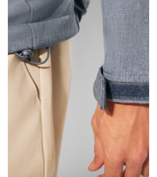Softshell de tres capas, con resistencia al agua, corta vientos, tejido 95% poliéster - 5% elastano y manga ranglan para mayor comodidad durante el movimiento, el interior es 100% poliéster micropolar para brindar mayor calidez. Cierre principal de cremallera con protector de barbilla, cuenta con dos bolsillos laterales con cierre de cremallera, además de otro bolsillo en el pecho también de cremallera, ambos con tirador, los puños son ajustables con velcro, los bajos tiene cordón elástico con ajustadores laterales.