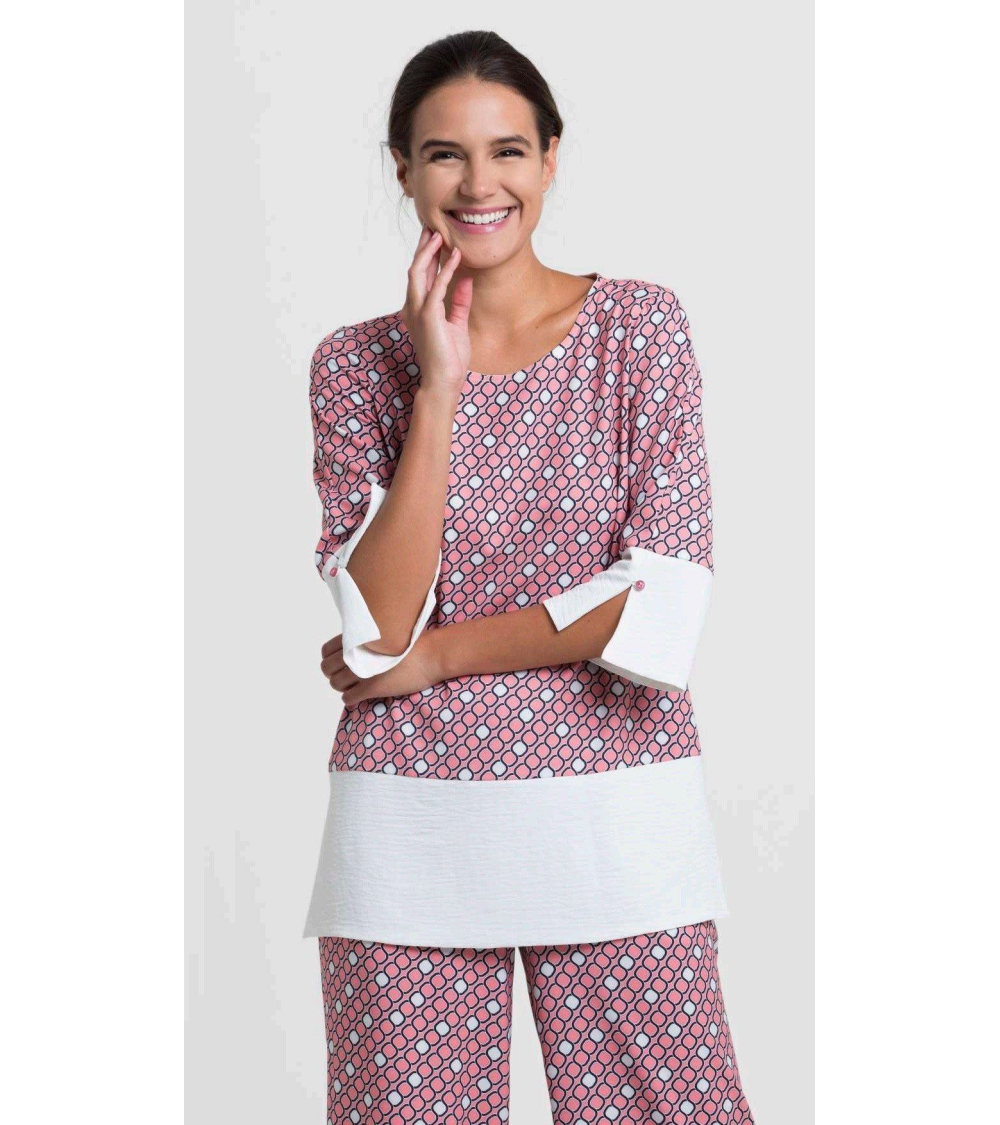 Blusón de mujer, muy cómodo, tela transpirable, con amplio escote redondo, bajo de prenda y de manga con abertura.
