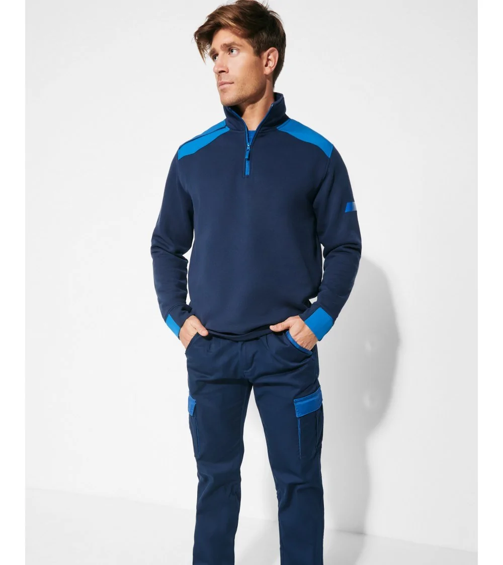 Sudadera de cuello alto y media cremallera, el interior del cuello cuenta con cubre costuras reforzado, detalles en contraste en los puños y hombros, punto canalé en el bajo y mitad del puño.
