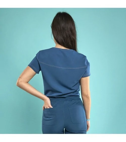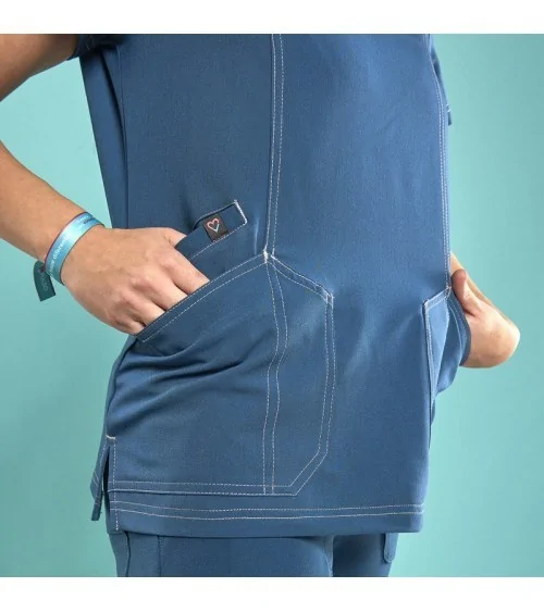 Casaca sanitaria para mujer, con corte ajustado, cuello en V, el tejido presenta una gran elasticidad, aberturas en los laterales, para mantenerse ajustado al cuerpo y permitir facilidad de movimiento, es antibacteriano y transpirable, por lo que ayuda a evitar los malos olores y regular la humedad, además cuenta con 5 bolsillos funcionales en los costados y trabilla en el cuello.